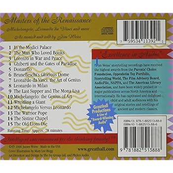 From School Library Journal Grade 5 Up—Major figures of the Renaissance are introduced in a narrative by master storyteller Jim Weiss that brings the basics of art, history, and politics of the time to life. Italy in the late 15th century became a center of culture and innovation. The historical background of the Renaissance is briefly explained, but the focus of these 15 tracks is on famous artists and works of art. Felippo Brunelleschi, Donatello, and Lorenzo Ghiberti helped revolutionize art through works such as "Gates of Paradise" in Florence. Leonardo da Vinci's work as a painter, sculptor, inventor, and military engineer is explained in detail, with emphasis on the "Mona Lisa," the "Last Supper," and his clay horse model. Michelangelo's life, his famous paintings in the Sistine Chapel, and his sculptures are explored in historical context. Weiss uses slightly different voices to tell the story in a seamless manner. Some prior knowledge about the history, art, and religion of the Renaissance will help listeners better understand this overview. Teachers should make visuals of these works of art and the artists available to help students make connections while they are listening to these stories.—Teresa Wittmann, Westgate Elementary School, Edmonds, WA Copyright © Reed Business Information, a division of Reed Elsevier Inc. All rights reserved. Read more About the Author Award winning, master storyteller Jim Weiss. Read more From AudioFile Jim Weiss depicts the youthful Michelangelo and Leonardo Da Vinci as competitors in Renaissance Florence. Weiss transforms history into adventure as the powerful Medici family thwarts assassins, builds political unity, and supports the two young artists. Weiss packs history into 15 stories as he recounts the young artists' educationâ focusing on the brilliant architects, sculptors, and artists, such as Donatello and Brunelleschi, who set the stage for them. Weiss not only brings these characters to lifeâ flaws and all, he makes listeners eager to continue the relationship, telling them to "go to your local library or bookstore and start a little renaissance of your own." D.P.D. © AudioFile 2007, Portland, Maine-- Copyright © AudioFile, Portland, Maine Read more